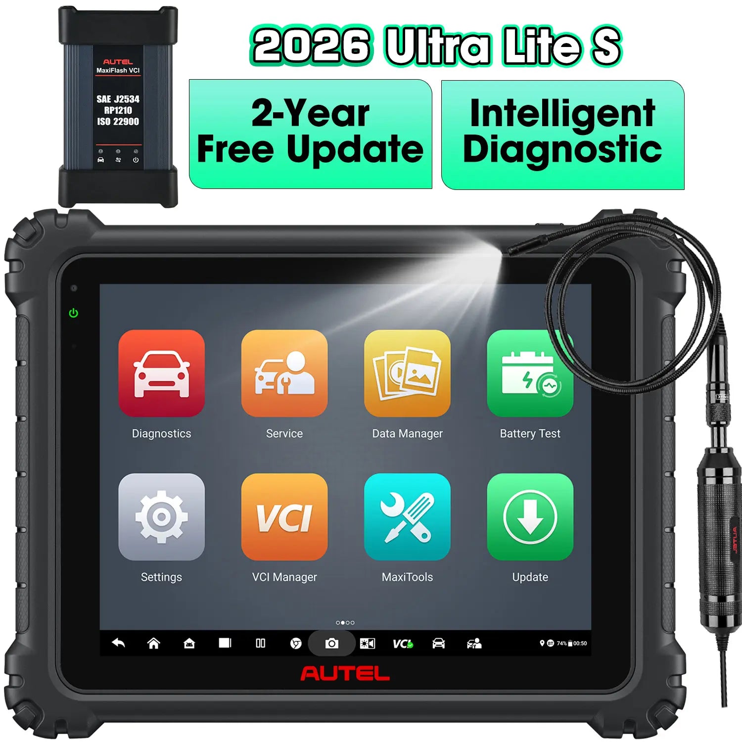 Autel MaxiCOM Ultra Lite S is exclusively equipped with battery test ability(Work with BT506), and compatible with the MaxiVideo MV108S inspection camera for up-close visual inspections.