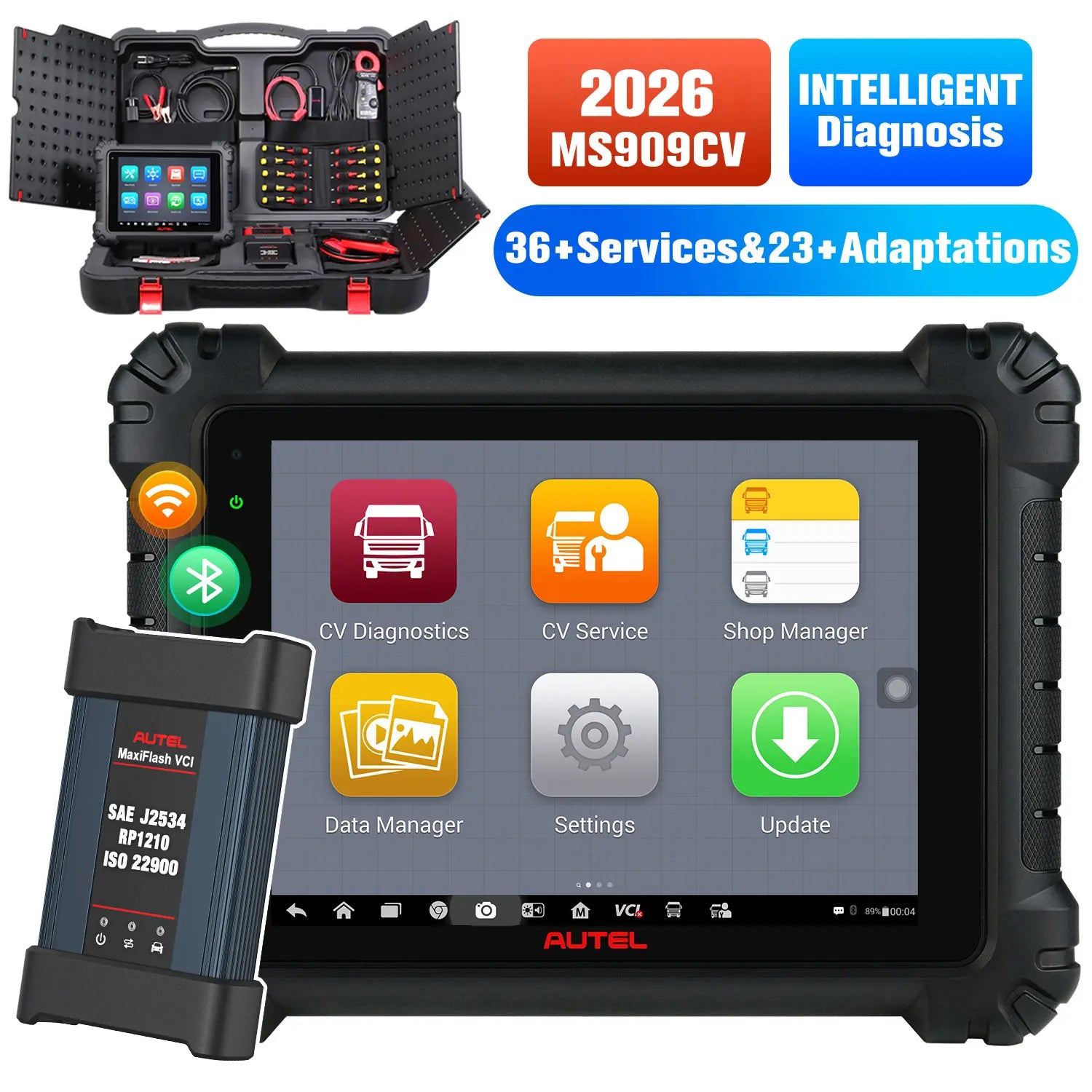 Autel's newest CV scanner for 2026 is the Autel MS909CV, which is the upgraded version of the MS908CV and MS906CV. As one of the flagship products in the Autel Maxisys line, the MS909CV brings comprehensive updates in all aspects. Equipped with a powerful 2.2GHz Quad-core A73 + 1.8GHz Quad-core A53 processor, 4GB RAM, 128GB on-board memory, and a massive 15000mAh battery, this intelligent diagnostic tool sets the industry standard for heavy truck repair and maintenance. With features such as topology mapping and advanced diagnostics, the Autel MS909CV stands at the forefront of the industry.