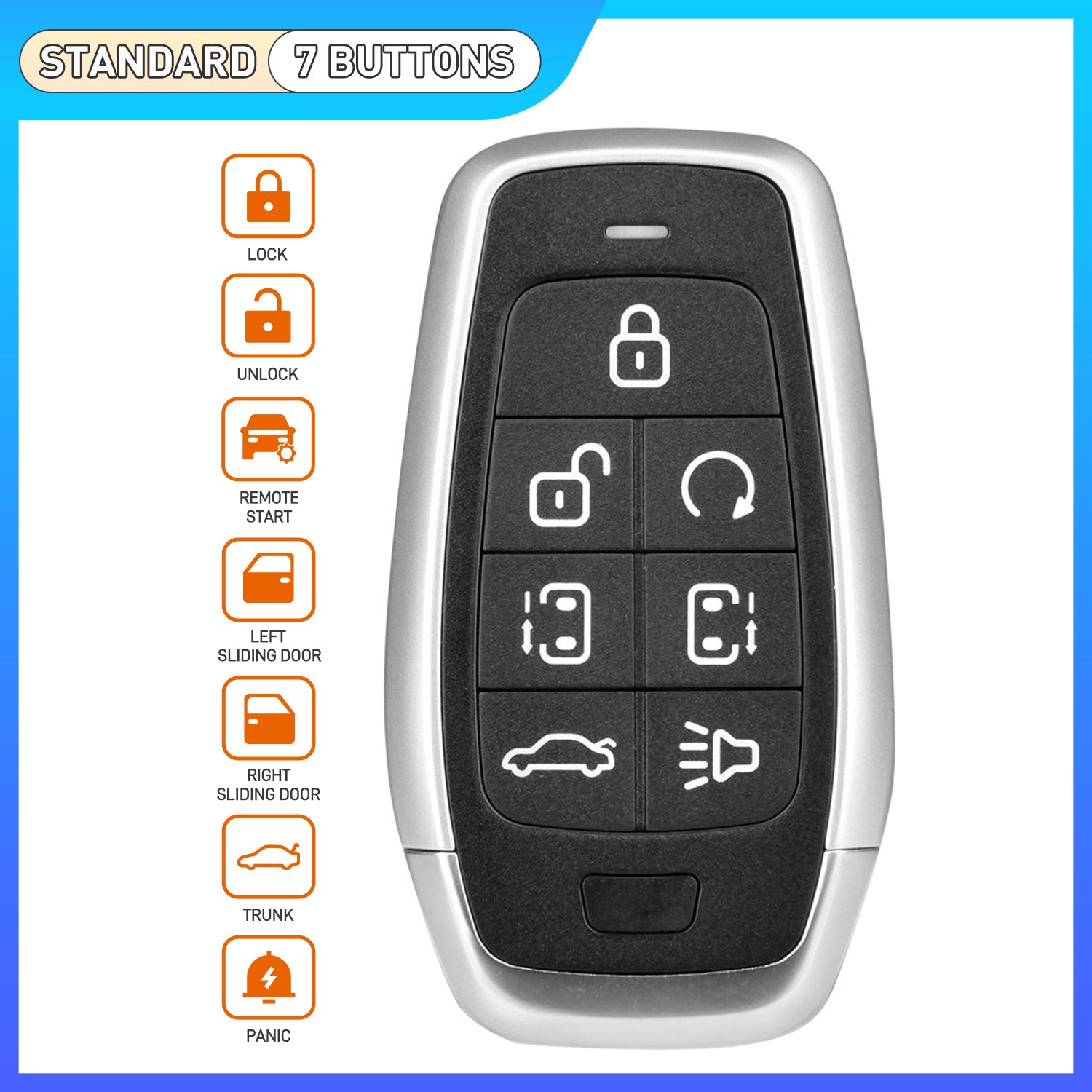- 7-button, Lock, Unlock, Remote Start, Left Door, Right Door, Trunk, Panic