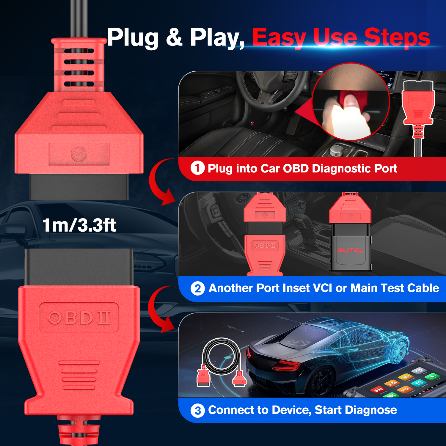 Autel OBD2 Extension Cable, 16-Pin Male to Female Adapter, 1m(3.3ft) Diagnostic Cord for All OBDII Vehicles. Compatible with all OBD2 scanners and diagnostic tools, this durable extension cable allows easier access to your vehicle's OBDII port without being restricted by the steering wheel.